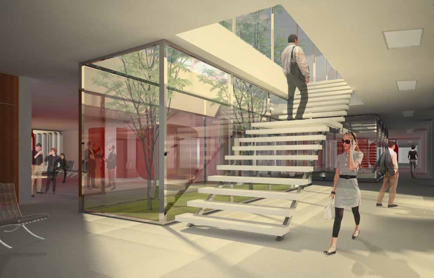 La apropiación del espacio por parte de los profesionales de las empresas de software si bien, no se apartan de otras disciplinas, si denotan algunas particularidades que deben contemplarse en el proyecto. Hay un alto porcentaje de jóvenes profesionales, con un elevado grado de concentración y dedicación en sus tareas. Se desarrollan proyectos de carácter diferencial, en grupo, individual, y en las mayores ocasiones los intercambios comunicacionales son on line y teleconferencias. El edificio contempla las particularidades, Un sistema de movimientos claro, recreado con lugares de estar y conectores de trabajo, escalera que comunica espacialmente con la planta superior. Esa situación de manera constante se abre a través de patios al exterior. Las unidades propias de trabajo, se conforma por una sistemática repetición del modulo espacio cerrado-patio, ampliando y definiendo un lugar flexible con equipamiento especifico. La planta alta esta destinada a los momentos de estar y descanso de las tareas cotidianas, la cafetería, y lugares intermedios de protección de sol y viento en algunas ocasiones, ocupan sumando el SUM y el Auditorio exterior la franja central de la planta del edificio, destinando su borde, al recorrido lineal enfatizando su borde hacia la calle Los Robles, por orientación y largas visuales de arboleda y más a lo lejos las sierra.
